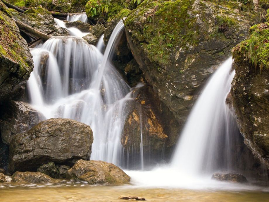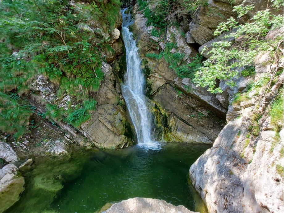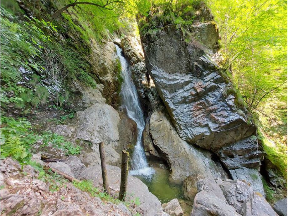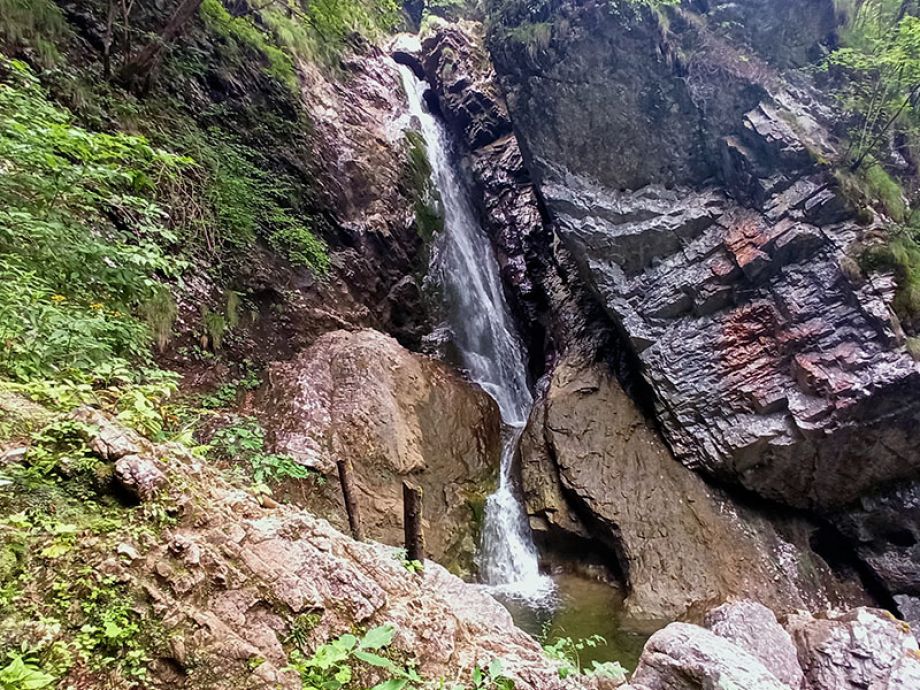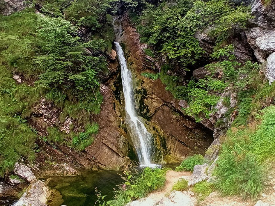 Od razcepa se spustimo do struge, jo prečkamo na levi breg in se vzpnemo po stezi nad vodo do naslednjega mostu. Za njim nas čaka še vzpon po krajši lestvi in že stojimo pred čudovitim četrtim slapom, visokim 17 metrov. Gre za najlepšega med slapovi, saj voda prosto pada v enem pramenu in se v široki pahljači razbije na štirimetrski dolomitni kopici sredi tolmuna. Steza mimo četrtega slapa poteka po desnem bregu in se vzpne nadenj, kjer preko mostu prečkamo ozek, 15 metrov globok kanjon, ki ga je urezala voda, poln kotličev in manjših slapov.