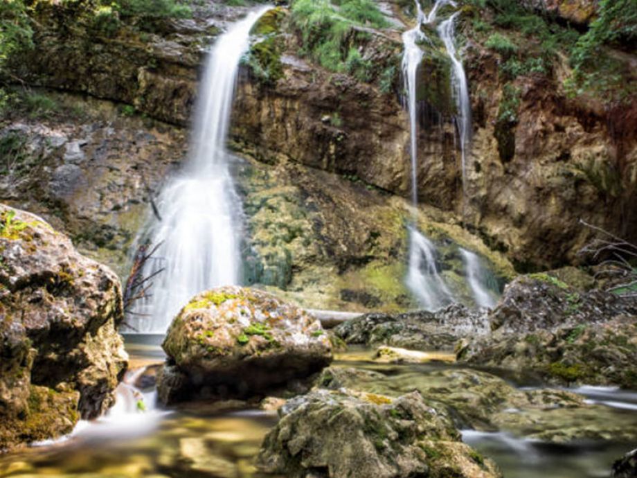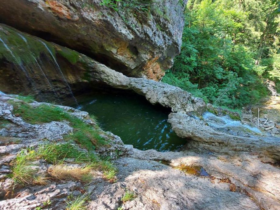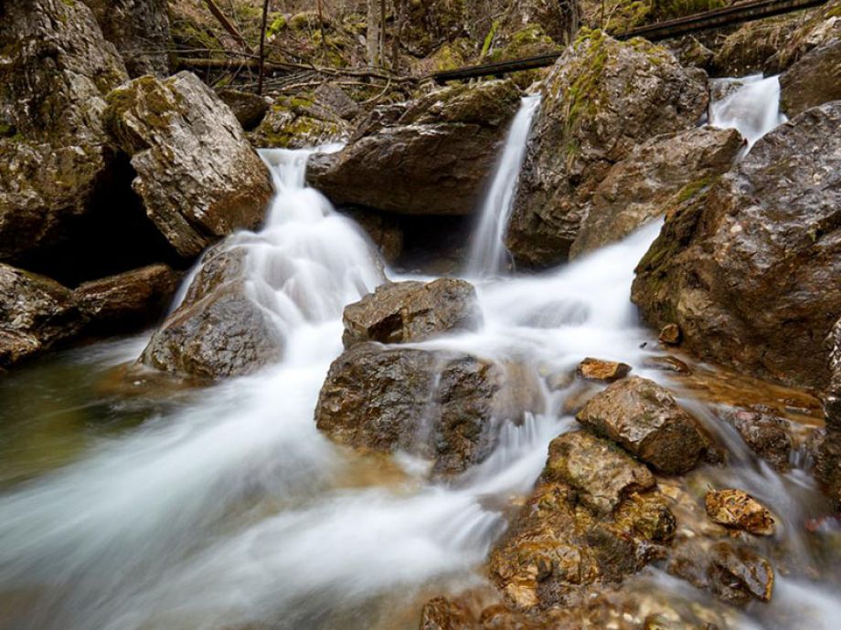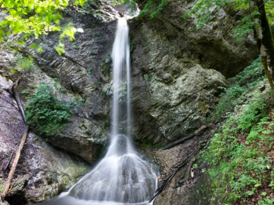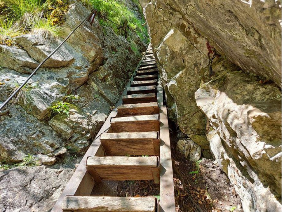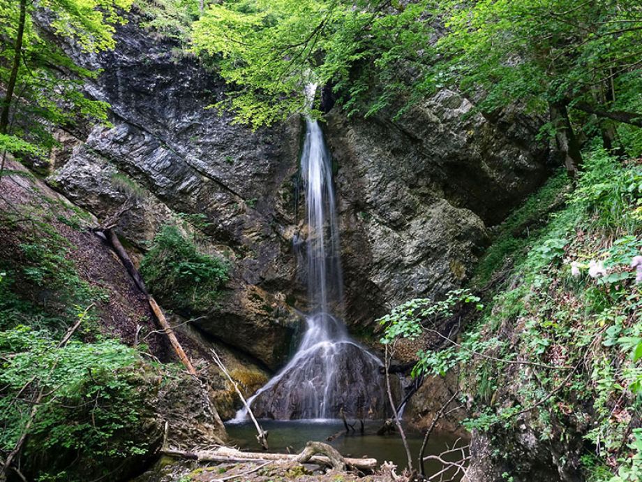 Od razcepa se spustimo do struge, jo prečkamo na levi breg in se vzpnemo po stezi nad vodo do naslednjega mostu. Za njim nas čaka še vzpon po krajši lestvi in že stojimo pred čudovitim četrtim slapom, visokim 17 metrov. Gre za najlepšega med slapovi, saj voda prosto pada v enem pramenu in se v široki pahljači razbije na štirimetrski dolomitni kopici sredi tolmuna. Steza mimo četrtega slapa poteka po desnem bregu in se vzpne nadenj, kjer preko mostu prečkamo ozek, 15 metrov globok kanjon, ki ga je urezala voda, poln kotličev in manjših slapov.